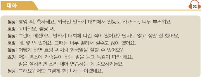 – 썸낭: 흐엉 씨, 축하해요. 외국인 말하기 대회에서 일등도 하고……. 너무 부러워요.