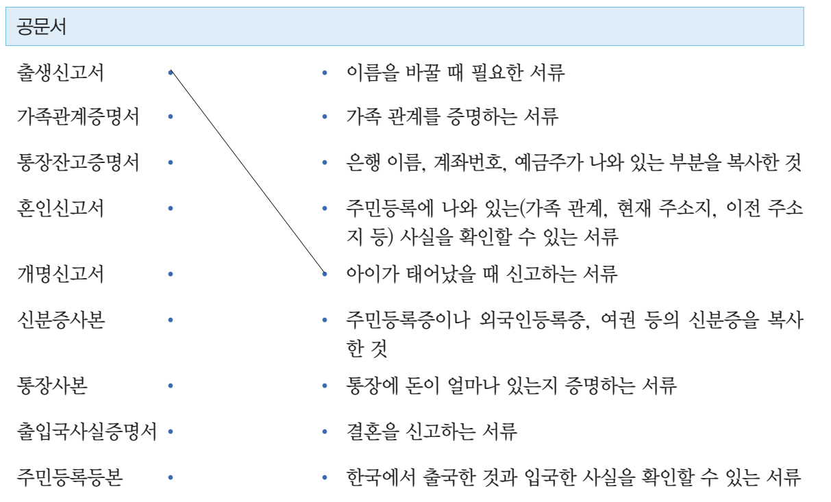 – (가족 관계증명서, 주민등록등본, 출입국사실증명서)을/를 발급받다/떼다: To be issued/ to get (a Family Relation Certificate, a copy of the Resident registration, Certificate of fact on entry and departure).