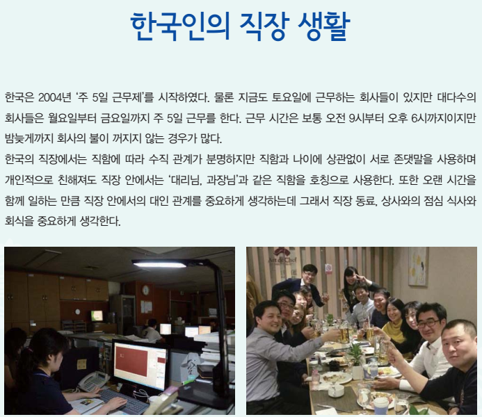 한국의 직장에서는 직함에 따라 수직 관계가 분명하지만 직함과 나이에 상관없이 서로 존댓말을 사용하며 개인적으로 친해져도 직장 안에서는 ‘대리님, 과장님’과 같은 직함을 호칭으로 사용한다. 또한 오랜 시간을 함께 일하는 만큼 직장 안에서의 대인 관계를 중요하게 생각하는데 그래서 직장 동료, 상사와의 점심 식사와 회식을 중요하게 생각한다.