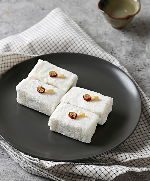 백설기: Baekseolgi (a white rice cake made by soaking rice flour in water to let it swell, then steaming it)