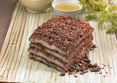 인절미: Injeolmi (a type of tteok made by steaming glutinous rice, pounding it until it becomes chewy, cutting it into rectangular pieces, and coating them with soybean powder or red bean powder)