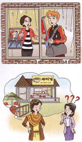 가: 어, 밖에 비가 오네요. Hey, it’s raining outside.